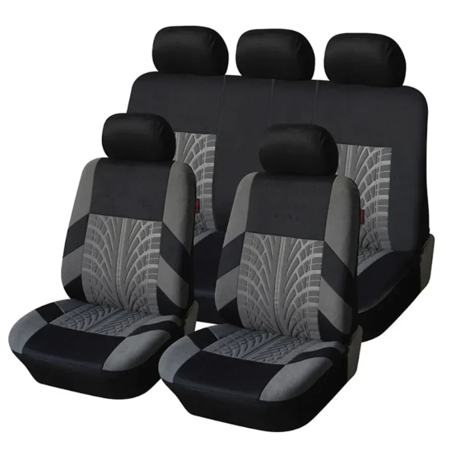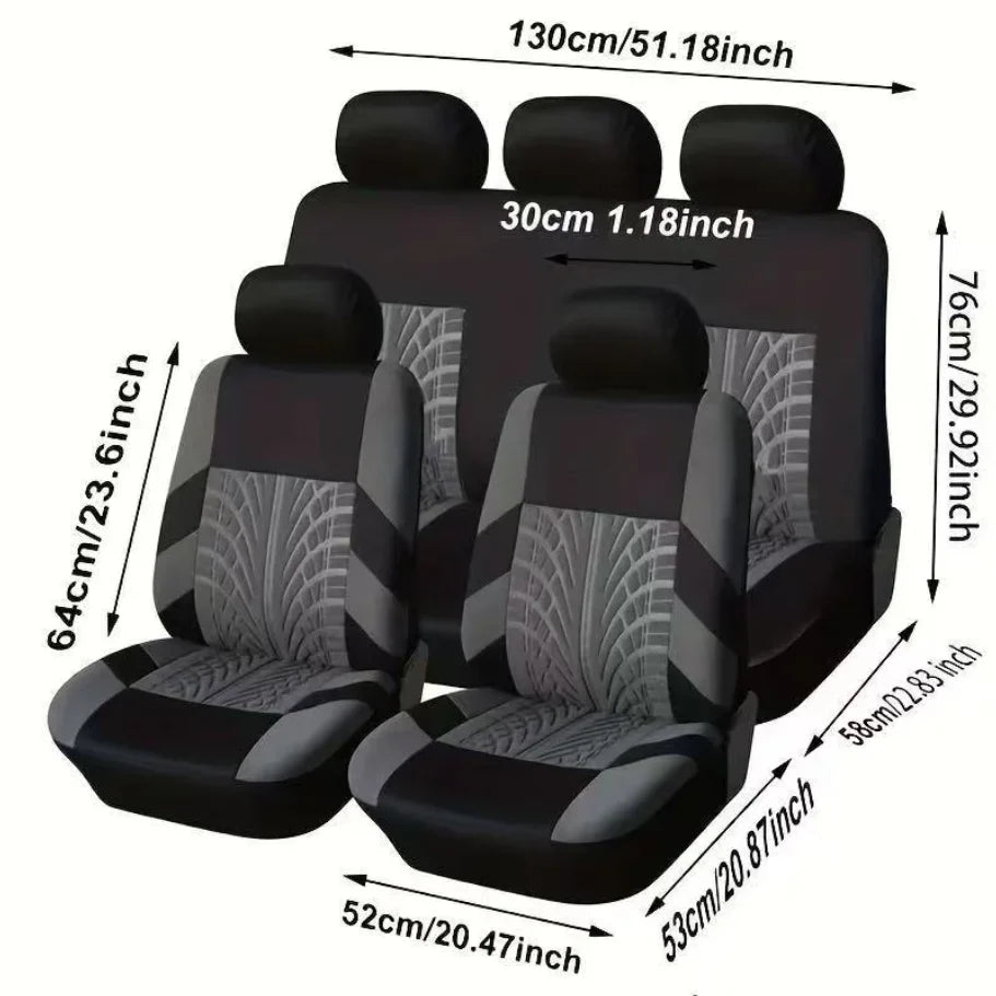 Dale a tu vehículo un estilo más deportivo y moderno con este juego completo de fundas de asientos universales con diseño inspirado en el patrón de neumático, ideal para quienes buscan protección y personalidad en el interior del auto.